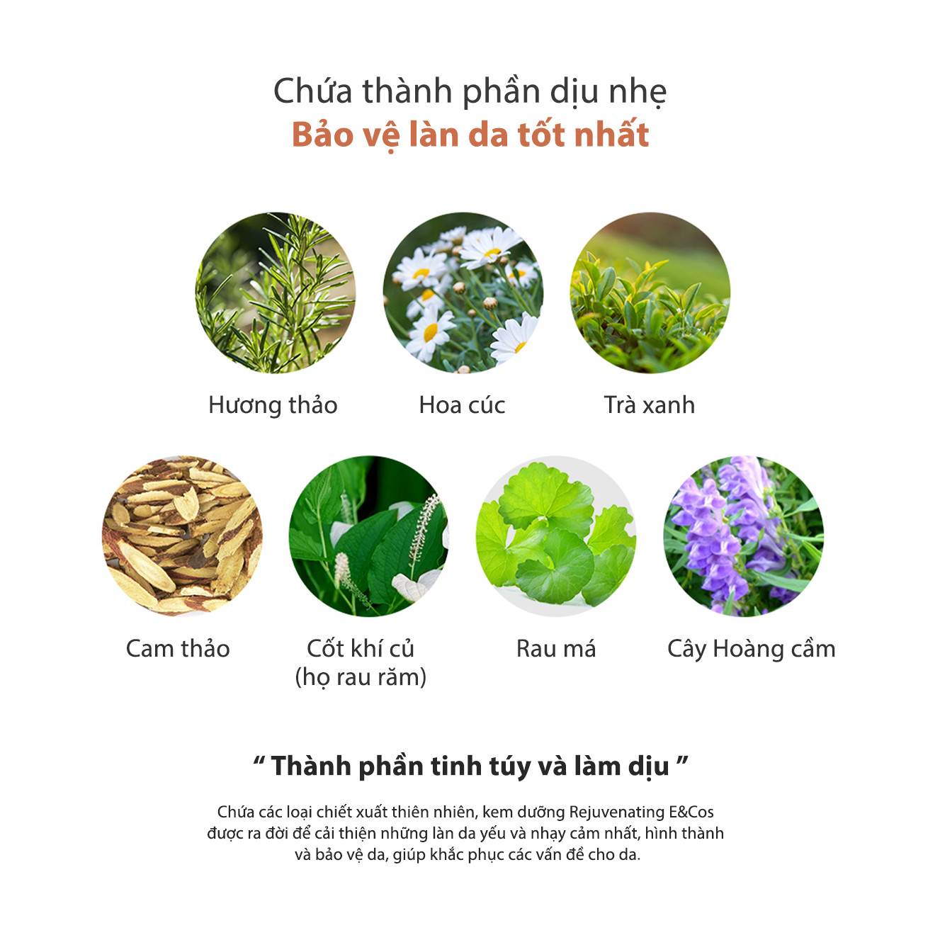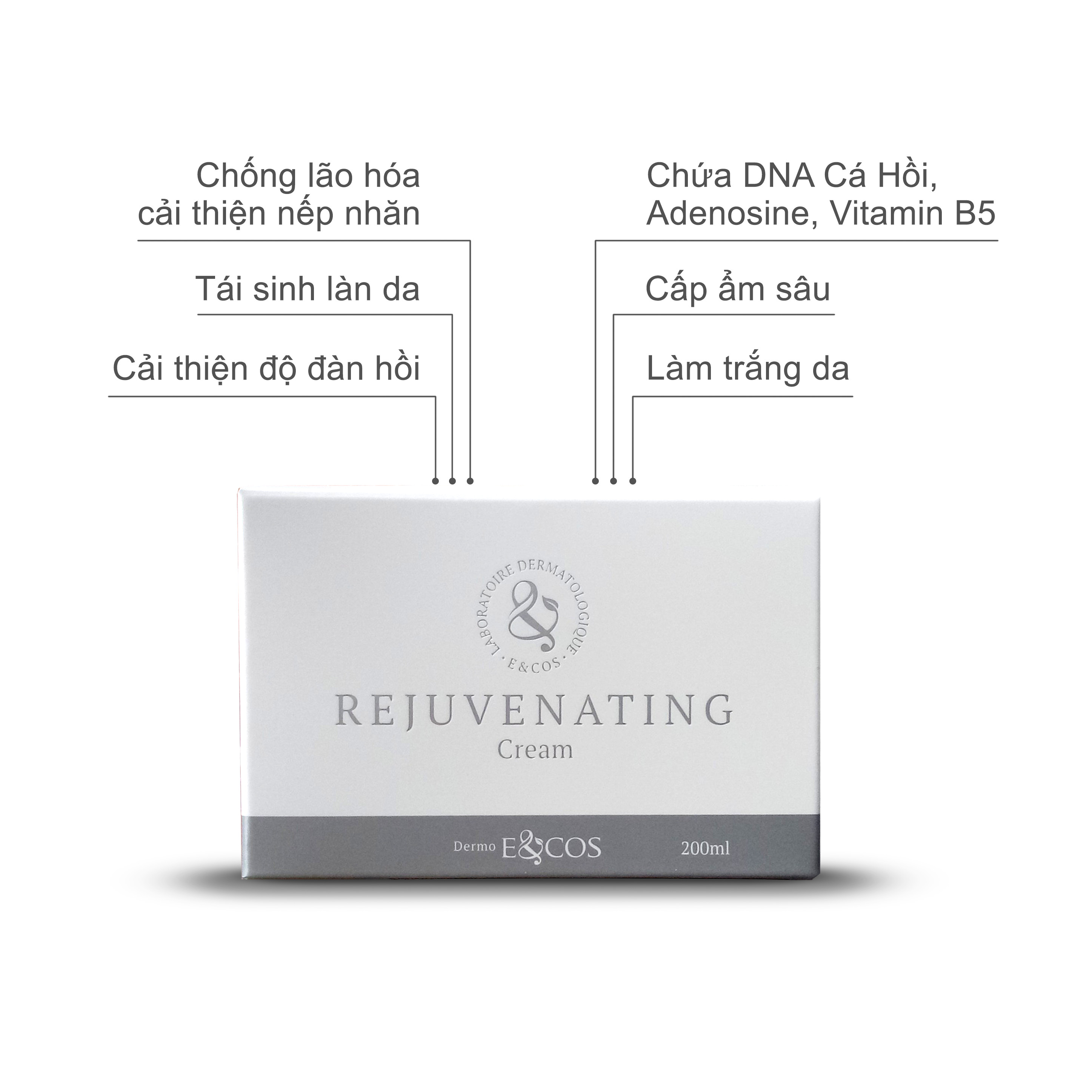 Công dụng: Kem Rejuvenating có chứa Adenosine và Panthenol là 2 thành phần có chức năng ngăn ngừa nếp nhăn và lão hóa, bảo vệ màng da, cấp ẩm, tái tạo da. Chiết xuất từ thực vật với đặc tính làm dịu và tái tạo da tuyệt vời với ba thành phần được cấp bằng sáng chế bảo vệ da và cải thiện độ đàn hồi của da, ngăn ngừa lão hóa da. Kem không chứa bất kì hương thơm nhân tạo hay chất nhũ hóa nhân tạo nào nên không gây kích ứng và có thể sử dụng cho da bị mụn…