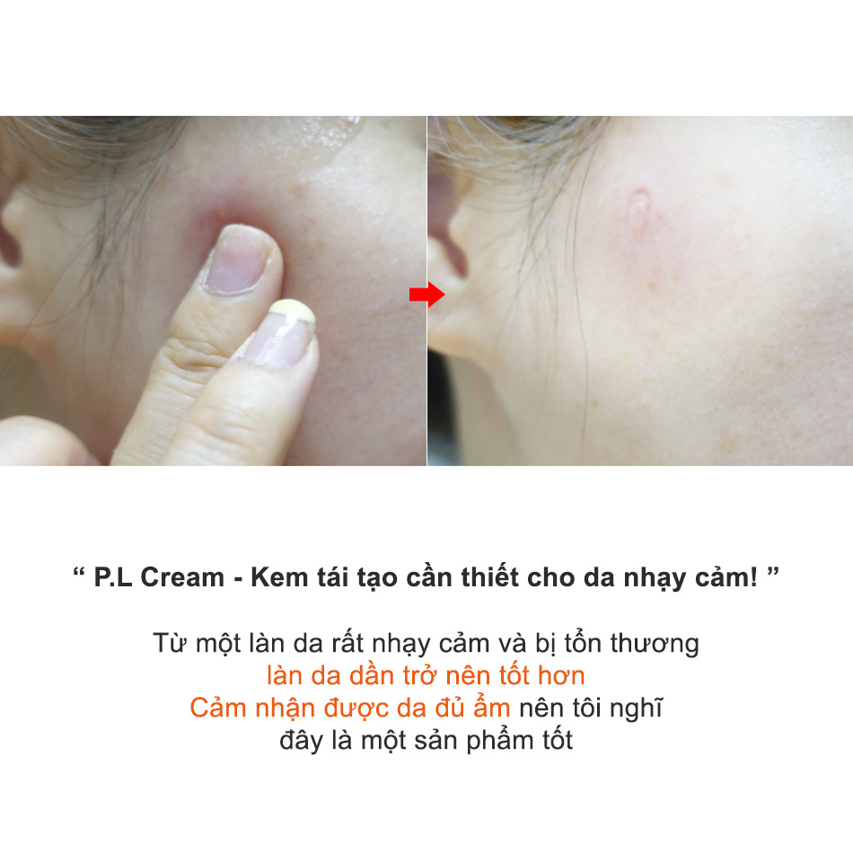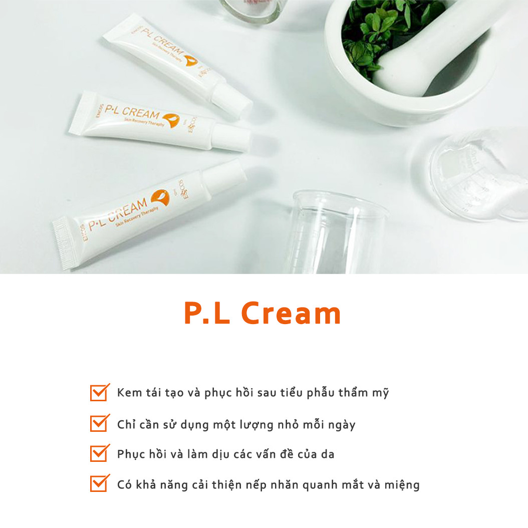 Công dụng: Loại bỏ đốm sau tiểu phẫu Laser, phục hồi da bị tổn thương sau laser. P-L Cream là kem tái tạo da, có khả năng dưỡng ẩm và làm dịu các vùng da yếu, lấy lại độ đàn hồi cho da. Ngoài ra, sản phẩm còn có khả năng cải thiện nếp nhăn ở vùng quanh mắt.