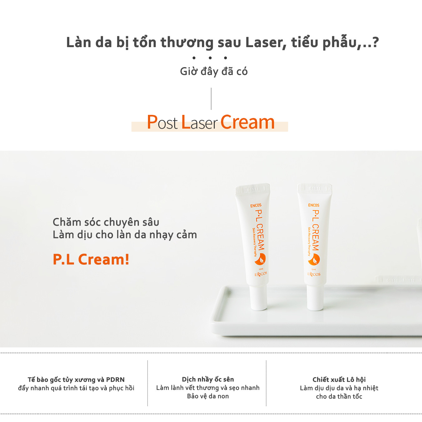 Đặc trưng sản phẩm: Với thành phần chính là dịch nhầy ốc sên, chiết xuất mô nuôi cấy nhân sâm và Allantoin, kem tái tạo P-L E&COS có khả năng phục hồi da bị tổn thương sau các liệu trình xâm lấn và tác động da như Laser.