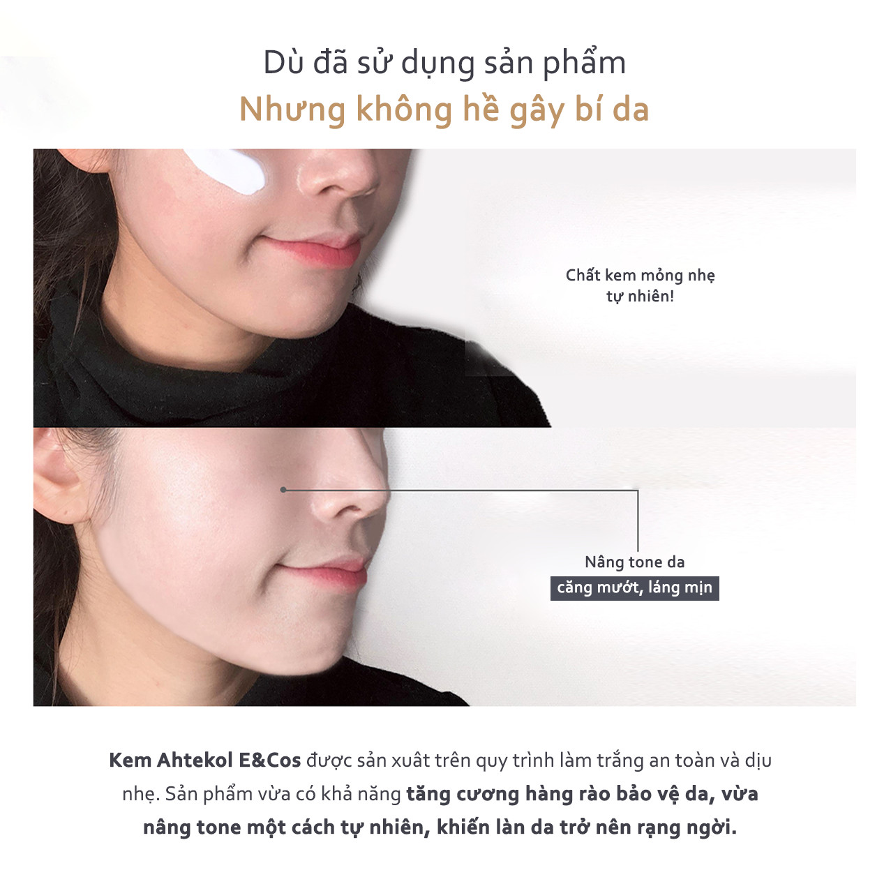 Công dụng: Kem nâng tone Ahtekol Whitening E&COS với công thức làm ẩm và mềm mại, che phủ được hầu hết các khuyết điểm trên da và làm sáng da, giúp da đều màu hơn. Kem nâng tone có khả năng chống nước nên khi sử dụng sẽ không bị trôi bởi mồ hôi hoặc nước, tạo cảm giác sử dụng rất tuyệt vời.